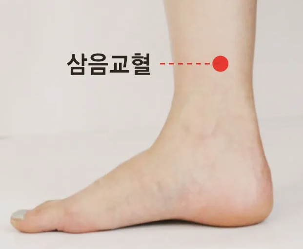 발목 안쪽에 튀어나온 복사뼈 위로 손가락 세마디 길이 위로 올라간 위치에 움푹 들어간 곳이 삼음교혈자리 입니다. 삼음교혈은 비뇨, 생식기 건강에 도움이 되며 정력 개선, 생리통 완화, 자궁질환에 효과가 있습니다.