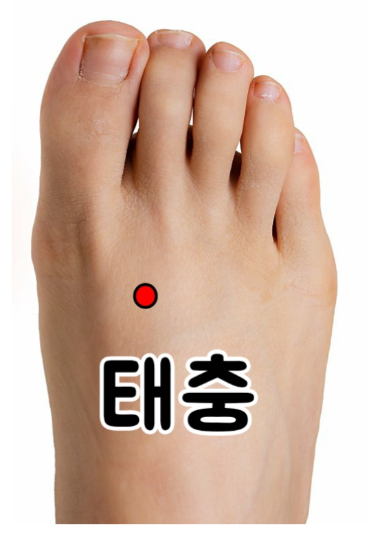엄지발가락과 둘째 발가락 사이에서 2~3cm 아래쪽에 위치한 태충혈은 간질환 완화, 소화불량, 근육통(긴장이완), 스트레스 해소, 불면증 완화, 변비 해소, 이명, 난청, 탈모에 좋습니다.