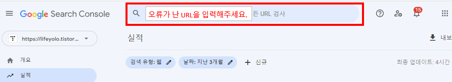 ③ 죄측 메뉴에 [URL 검사] 클릭하고 아래쪽 돋보기 옆에 오류난 URL을 입력하고 엔터키를 눌러주세요.