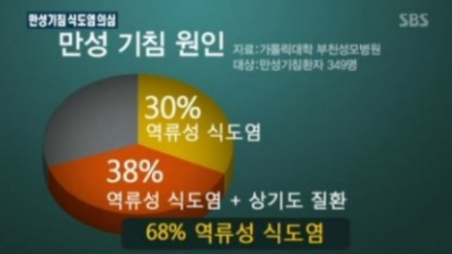 소화기 질환으로 위와 식도 사이의 근육이 약해지면서 위산이 역류하여 식도에 염증을 일으키는 질환입니다. 이 질환 역시 속 쓰림과 함께 위산 역류로 인해 마른 기침과 목소리 변화, 후두염 등의 증상이 나타날수 있습니다.