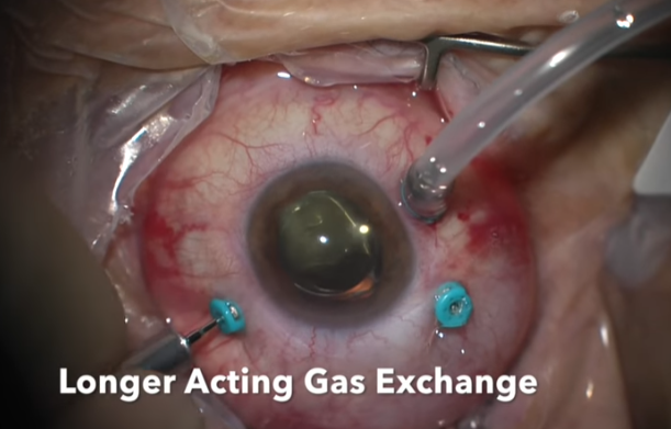 공기는 일주일 내에 모두 흡수되어 일반적으로 망막박리 수술에서는 충전물로 잘 사용하지 않고 가스의 경우 농도에 따라 팽창 정도와 지속기간을 조절할 수 있는 장점과 일정 시간 이후에 흡수되어 제거를 위한 이차 수술이 필요하지 않은 장점이 있습니다.