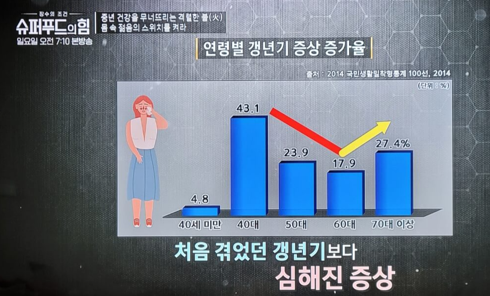 심지어 갱년기가 40대 중후반에 처음 찾아오고 그 증상이 50대 60대에 걸쳐 줄어들지만 70대가 되어 다시 한번 더 갱년기 증상이 급격하게 나타나는 시기가 옵니다.