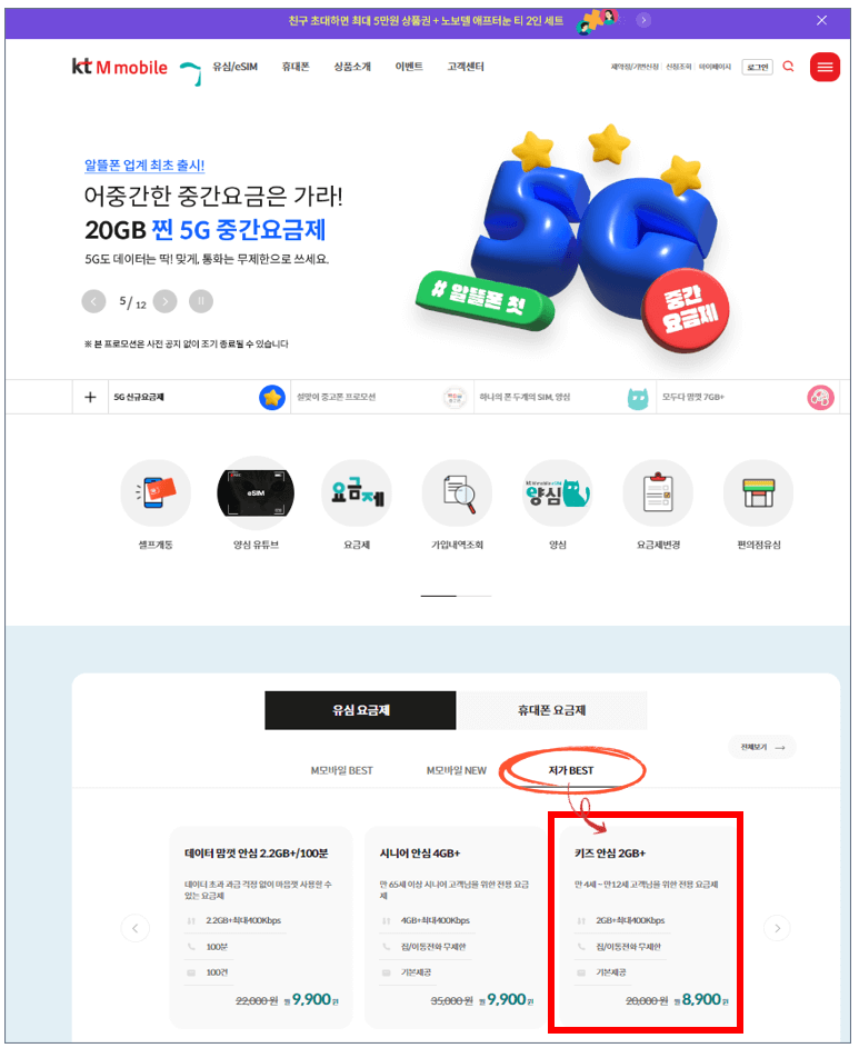 - [유심요금제] - [저가 BEST] - 키즈 안심 2GB+ 클릭