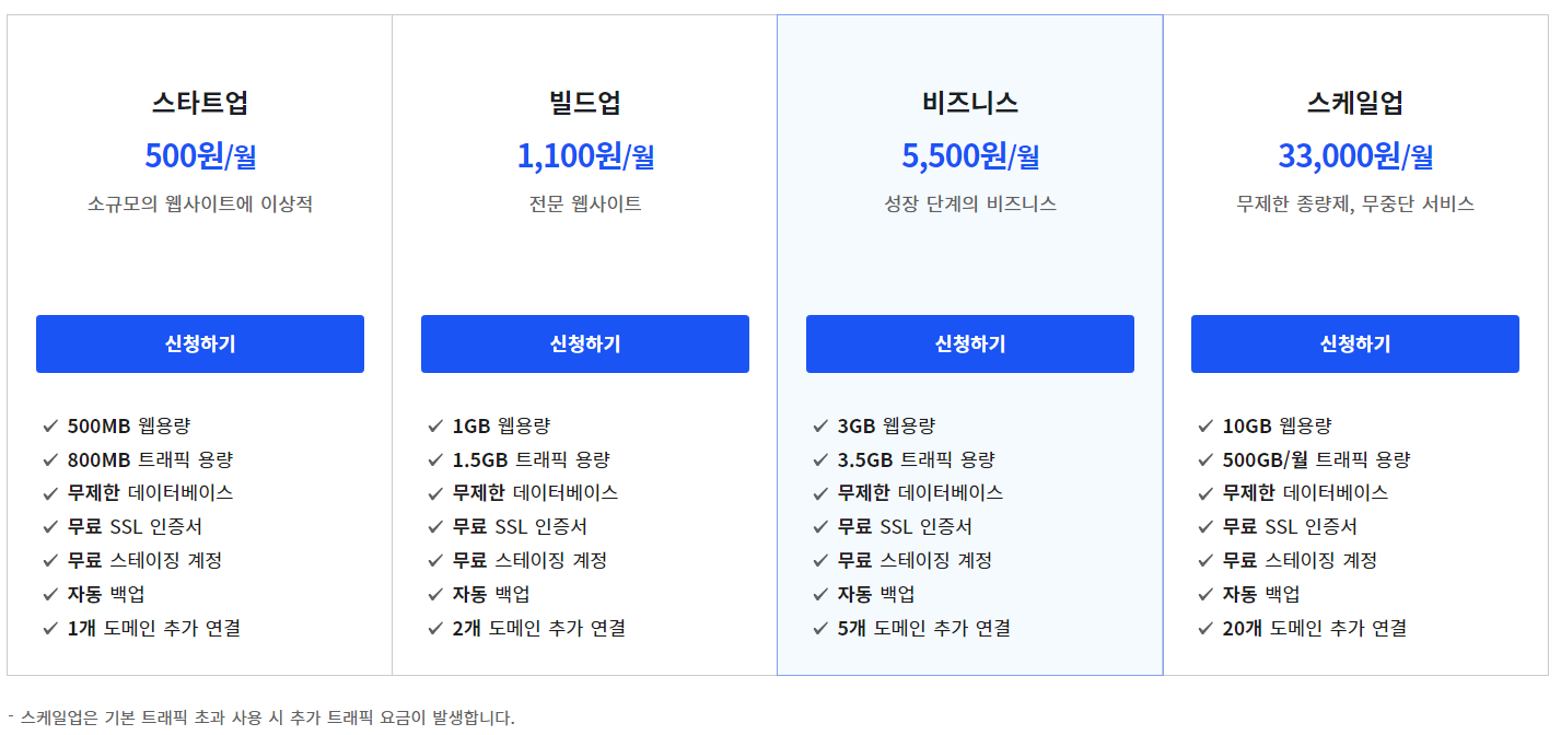 카페 24가 바로 우리나라 업체인데요, 가격이 정말 저렴합니다. 물론 용량을 키우면 가격의 클라우드웨이즈랑 비슷할 것 같지만 초보자가 시작하기에는 적합한 거 같아요.