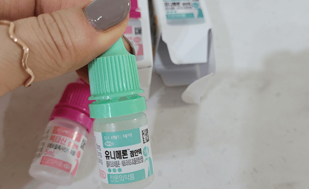 안과에 가서 쌀뜨물 세안 했다고 하니 의사 쌤이 눈에 닿으면 병균이 많기 때문에 충혈되고 각막염이 생길 수 있다면서 안약을 2개 처방해 주셨어요. 하나는 렉타신 점안액이고 하나는 유니메론 점안액입니다.