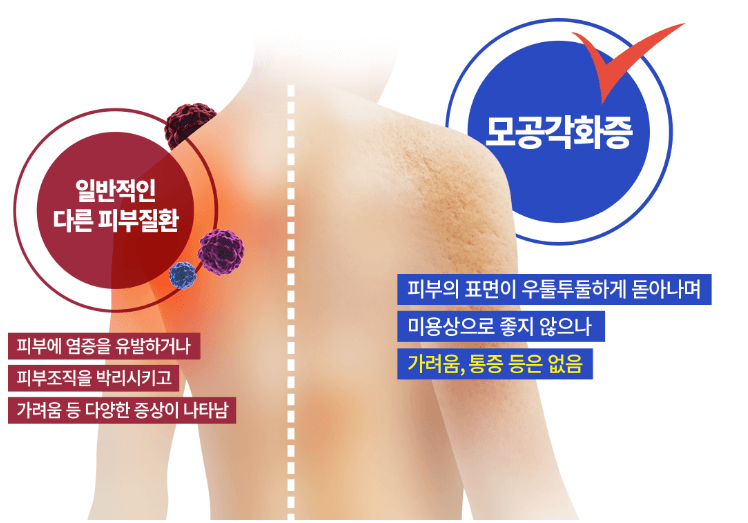 모공각화증은 피부의 모공이 각질로 막혀서 생기는 질환입니다. 이로 인해 피부 표면에 작은 돌기들이 생기며, 일반적으로 통증이나 가려움증은 동반되지 않습니다. 하지만 외관상으로는 보기 싫은 경우가 많아 많은 사람들이 고민하게 됩니다.