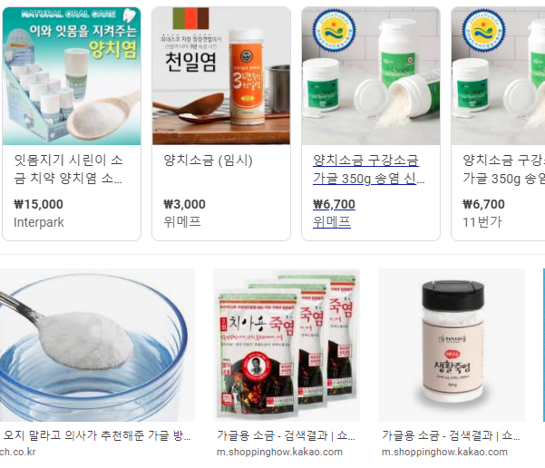 이렇게나 검색하면 많은 제품들이 있네요. 가격도 저렴하고 잇몸건강, 구내염, 인후염에도 좋은 소금 가글 겨울철 건조해지기 쉬운 목안을 건강하게 해줍니다. ^^