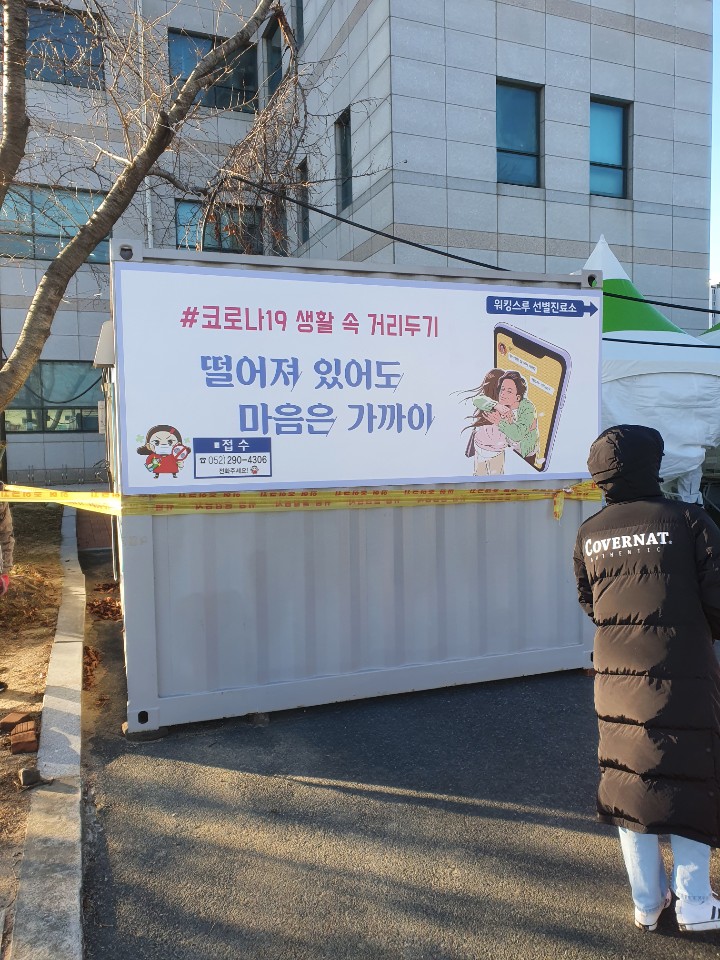다들 선별 진료를 받으러 온 상황이라 사회적 거리두기 간격을 유지하며 기다리고 있었지요.