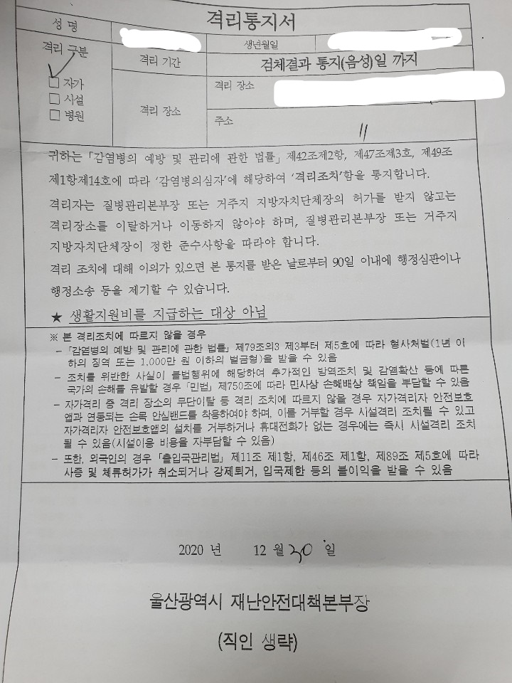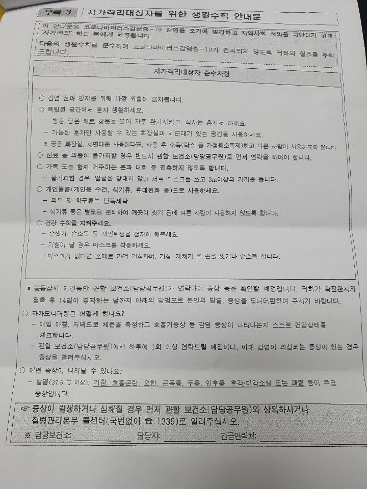 격리통지서와 자가격리대상자를 위한 생활 수칙 안내문 1부