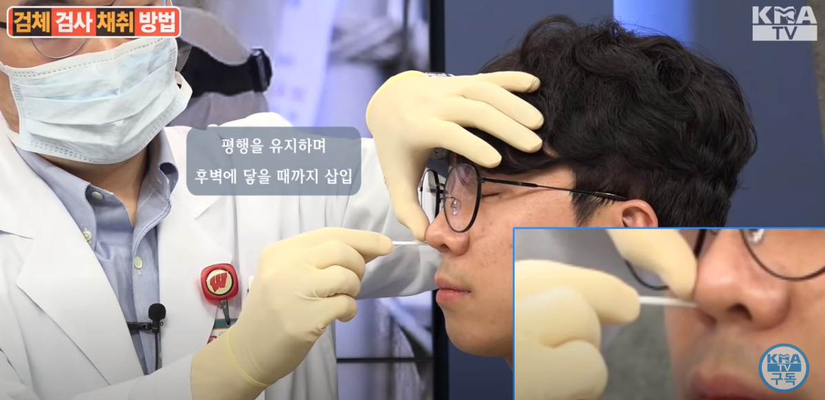 검사 기구를 코와 입안에 넣어서 타액을 뭍혀갑니다.